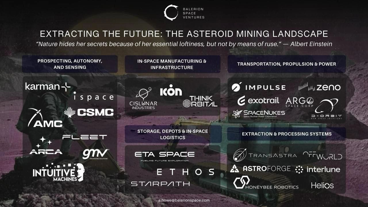 🖌Another Space Dirt, another Balerion Space Ventures (BSV) graphic. From BSV partner Phil Scully, “The Asteroid Mining Gold Rush Is Coming. Here's Who's Building the Picks and Shovels. Most people hear "asteroid mining" and think science fiction. We think it's the next trillion-dollar value chain. Aiden Howe mapped the asteroid mining landscape across five critical layers.”