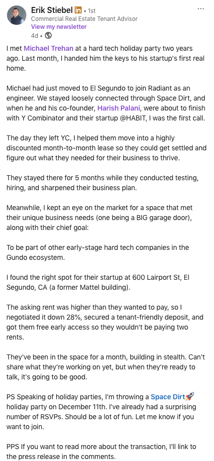Plus, two pieces of engaging content, a sublease opportunity in El Segundo, and details on our December 11th Space Dirt holiday mixer.
